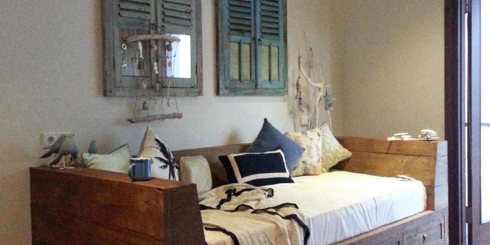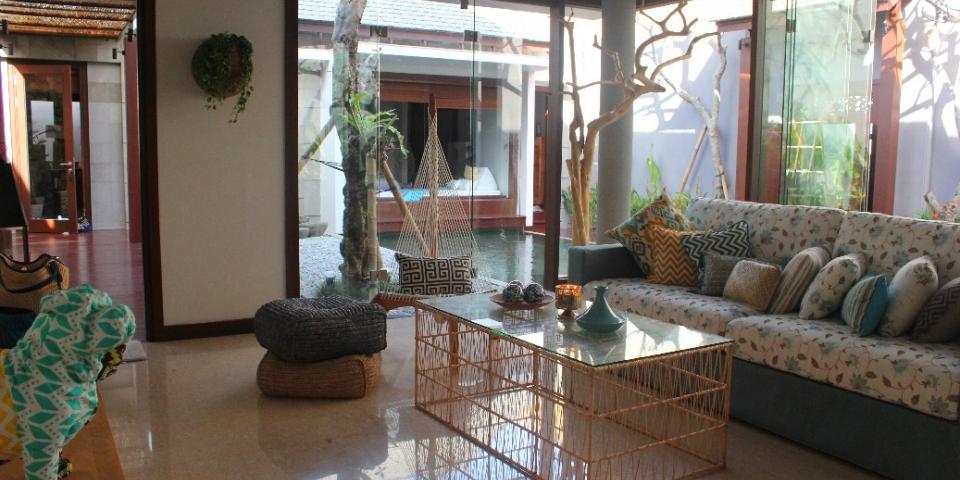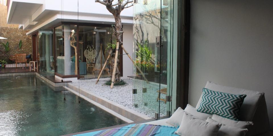 The day bed of the Master Bedroom, the living room and dining room area are all open to the pool deck.